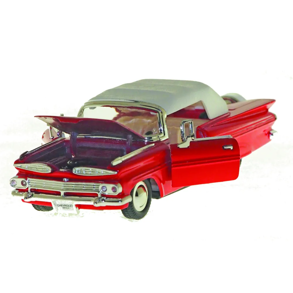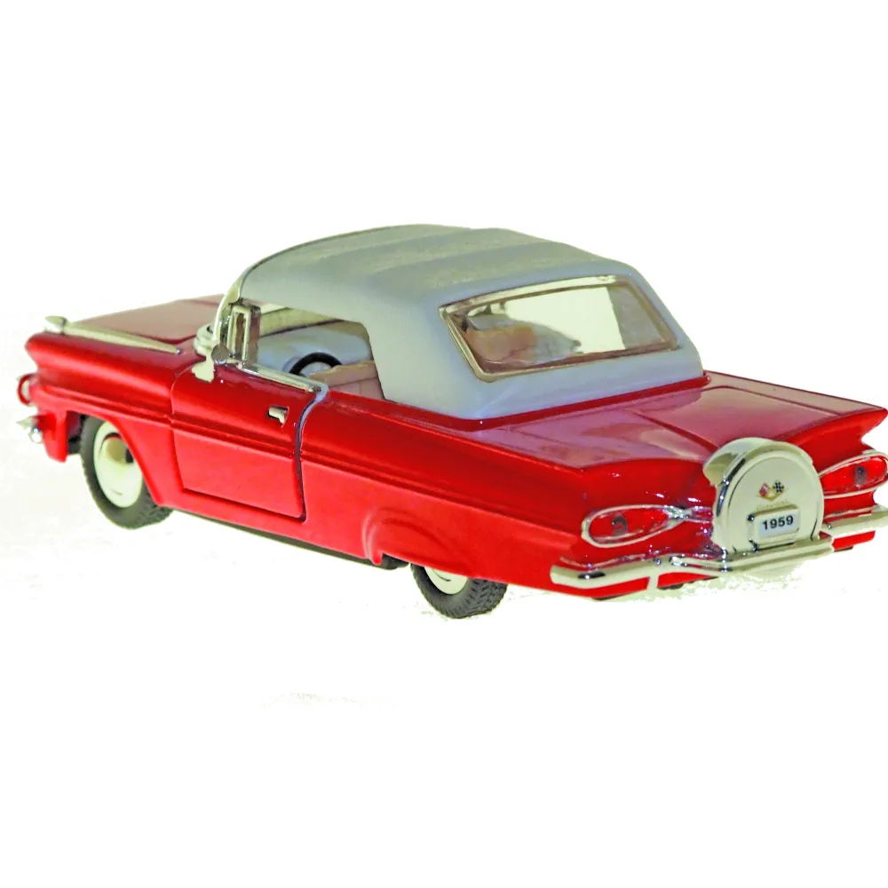 The 1959 Chevrolet Impala was radically reworked sharing bodyshells with lower-end Buicks as well as with Pontiac, part of a GM economy move, Chevrolets rode a wheelbase 11/2inches longer than before. Atop a new X-frame chassis, roofs sat three inches lower,and bodies measured more than two inches wider overall. The growing size contributed to increased curb weight, one more trend of the times. Its tailfins protruded outward ratherthan upward.