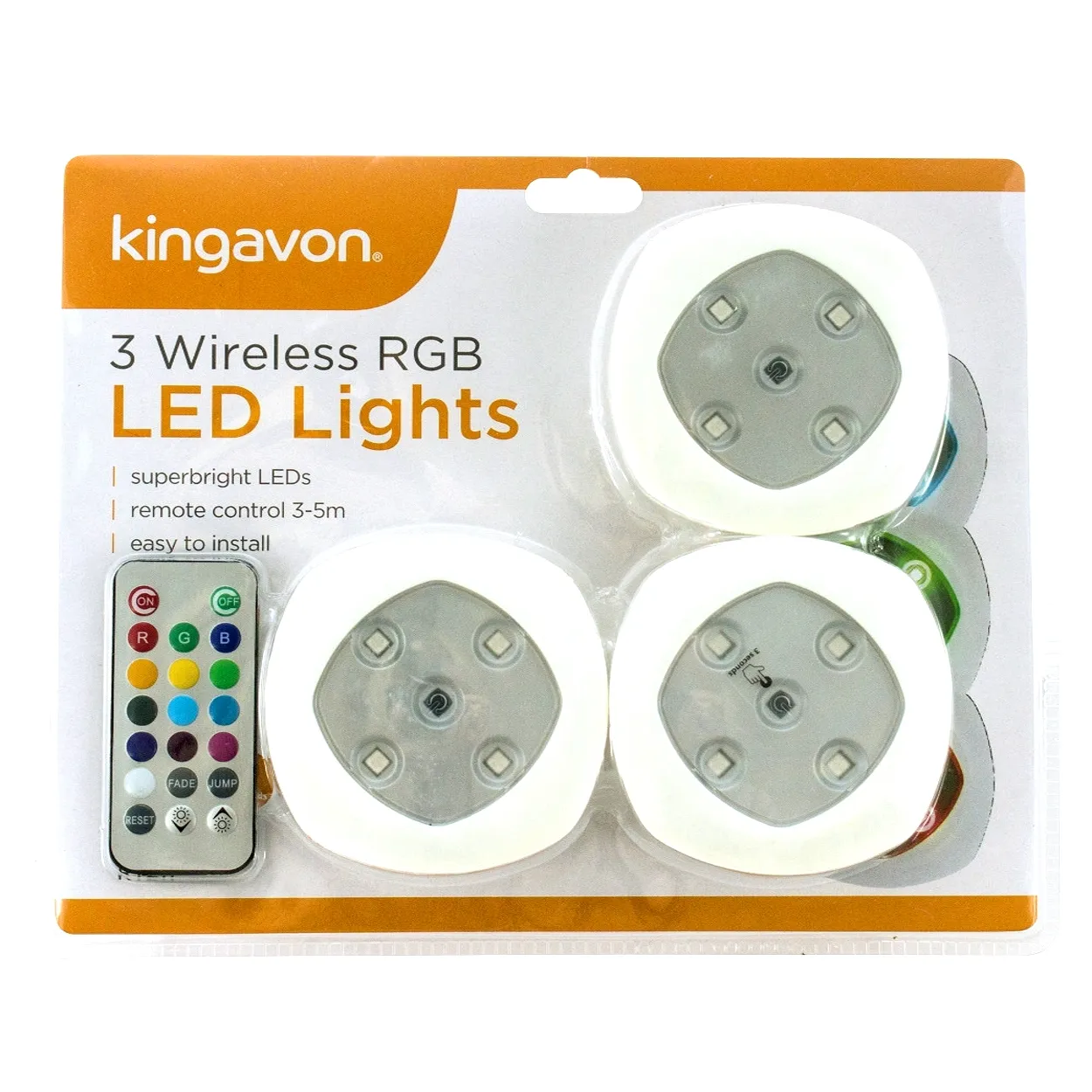Superbright LEDs, Remote control 3-5m, Easy to install and use. This is the set of 3 wireless remote control RGB colour changing remote control LED Lights which is ideal for home kitchen and garden decor. Wireless remote control lights are easy to install and simple to use light fixture in a set of 3 contemporary design to add a touch of modern elegance to the dining experience or outdoor light feature. Features: Wireless RGB Colour changing LED Lights Set 3 x colour changing lights with adhesive backs 1 x remote control Each light requires 3 x AA batteries (not supplied) Supplied with 1 CR2032 button cell battery for remote Remote control with 13 colour settings, brightness control, fade and jump settings Push and hold for 3 seconds to turn the light off or simply use the remote control