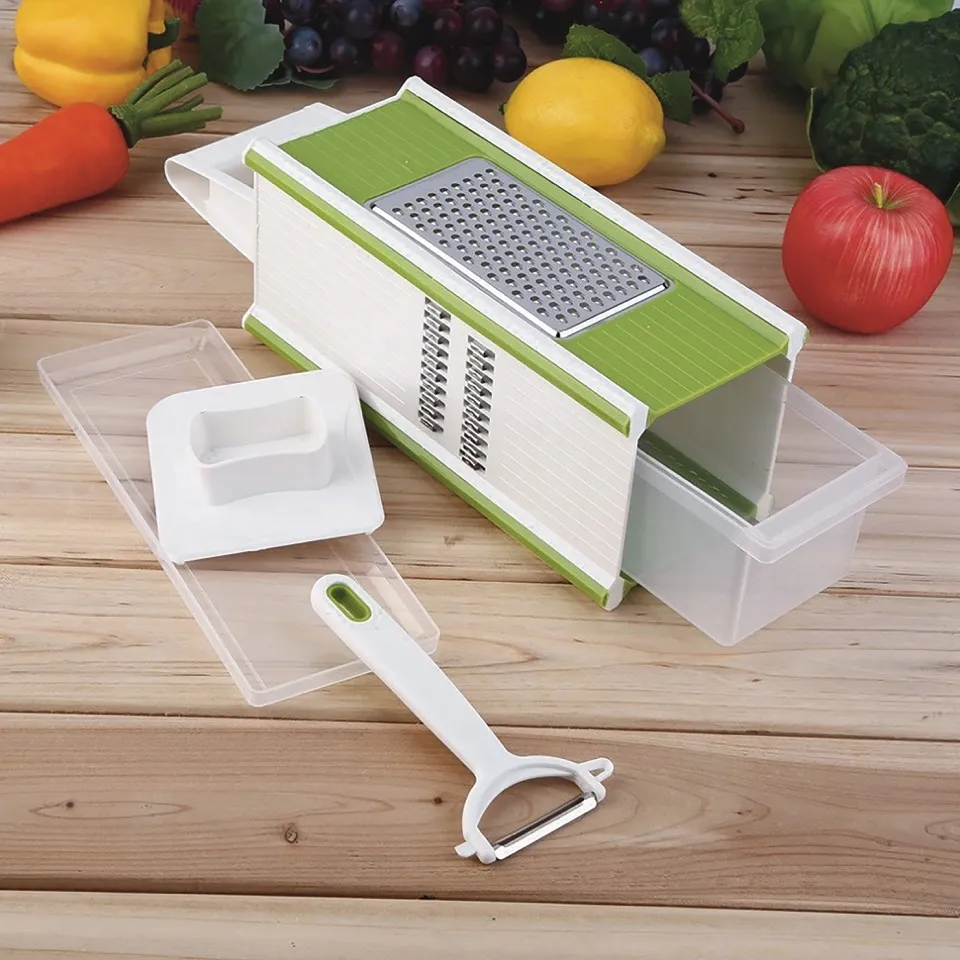 Transform your kitchen tasks with the 5 in 1 Vegetable Slicer & Grater Set. This essential gadget provides an efficient and convenient way to grate and slice all your favorite vegetables. Featuring a 4-sided grater with a removable tray, this set ensures a variety of slicing options to suit your culinary needs. The tray also includes a lid for easy storage.